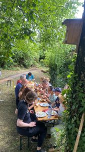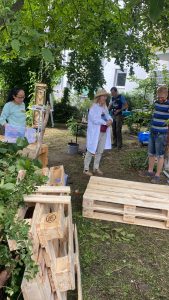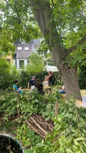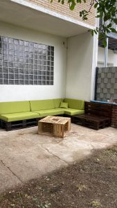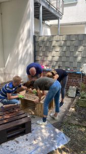 Das Team hat den Garten gründlich aufgeräumt, Unkraut entfernt, Beete gepflegt und den Raum wieder in einen einladenden Ort verwandelt. Anschließend wurde aus alten Paletten eine robuste und gemütliche Sitzgruppe zusammengeschraubt – perfekt, um später gemeinsam zu sitzen, zu plaudern und die Natur zu genießen.